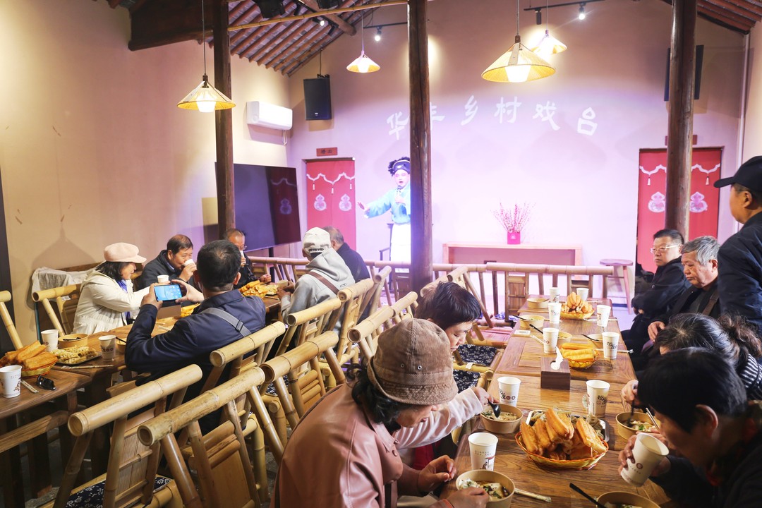 华丰村位于生态科技新城“自在半岛”,总面积3.35平方公里,是由扬州市凤凰岛投资发展有限公司打造的乡村振兴先导区。华丰村以华丰民宿为起点,串联华丰林里、客厅、食集三大场景,融合餐饮住宿、康养疗愈、萌宠玩乐、文化研学等多种体验,构建“1+3+N”城市微度假体系。在华丰村,大家实地了解文旅产业融合发展的生动实践。老会员们走进古法豆腐坊,围坐品尝农家现磨豆浆、茶点,欣赏扬剧经典选段。在演员清亮的唱腔与悠扬的器乐声中,多位老会员随节拍轻声哼唱,现场掌声不断。